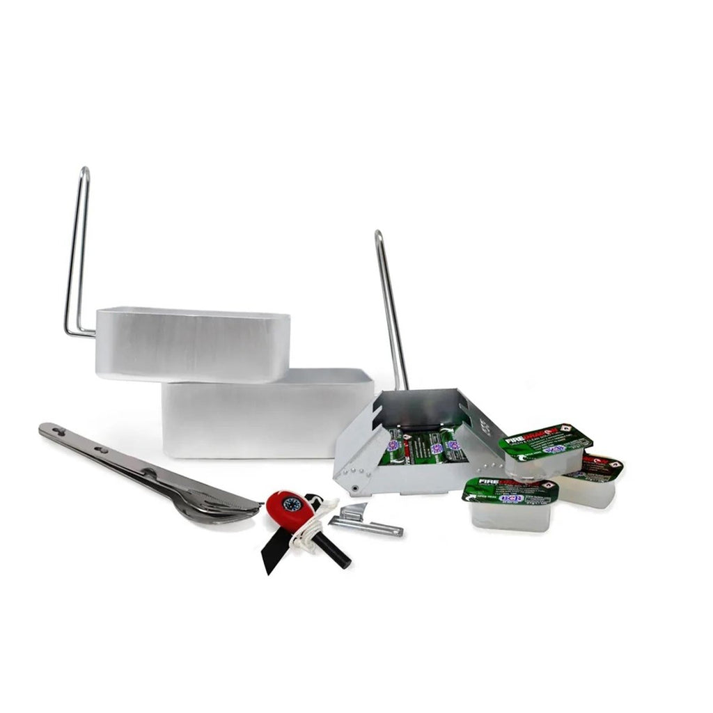 • SET INCLUDES : Poêle, boîtes à désordre, ensemble de couverts, carburant solide, ouvre-boîte, silex, attaquant