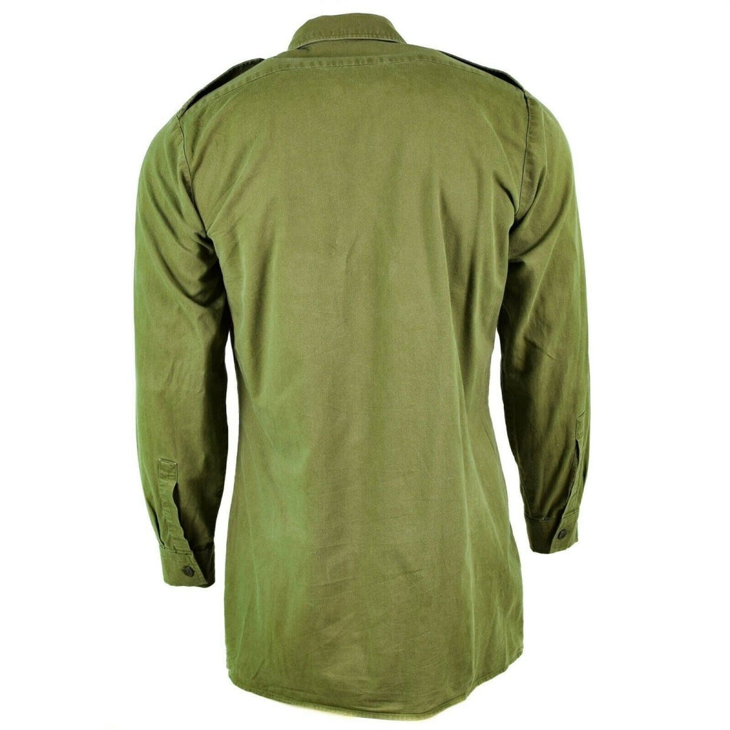Présentation de l'authentique chemise militaire formelle britannique en olive, un vêtement intemporel pour les occasions formelles. Avec ses manches longues, ses poignets boutonnés, ses épaulettes et ses poches poitrine, cette chemise respire l'élégance.