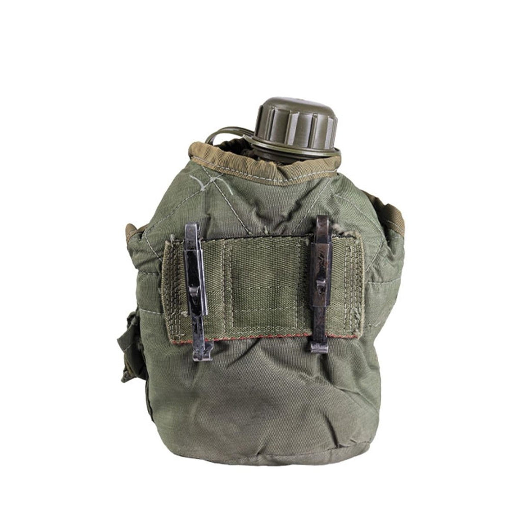 Cette cantine militaire américaine originale en plastique de 0,75 L avec couvercle pour équipement de terrain est un véritable article d'hydratation de l'armée conçu pour une utilisation fiable dans les environnements extérieurs et sur le terrain. L'ensemble comprend une gourde en plastique et une housse en tissu durable, fini dans une couleur olive classique typique de l'équipement militaire américain.