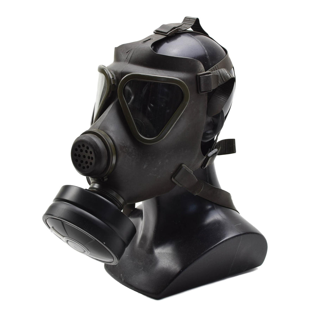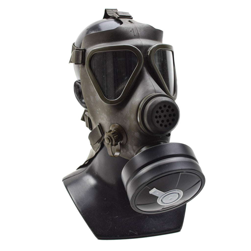The set includes the gas mask, original olive storage bag, and filter. The mask features a durable rubber body, adjustable head straps for secure fit, and a classic military design that makes it an excellent collectible or display piece.