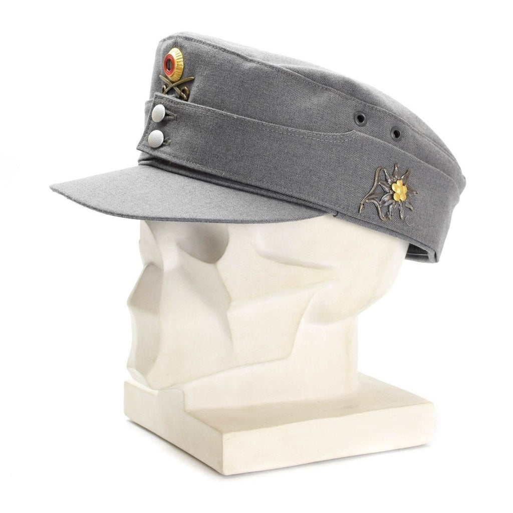 - This cap features an authentic design that stays true to its military roots. The floral badge on the front is more than just decoration. It represents the alpine heritage of the Gebirgsjäger and adds a distinctive touch to the cap. The neck flap provides crucial protection from wind and rain. Making it highly practical for various weather conditions.