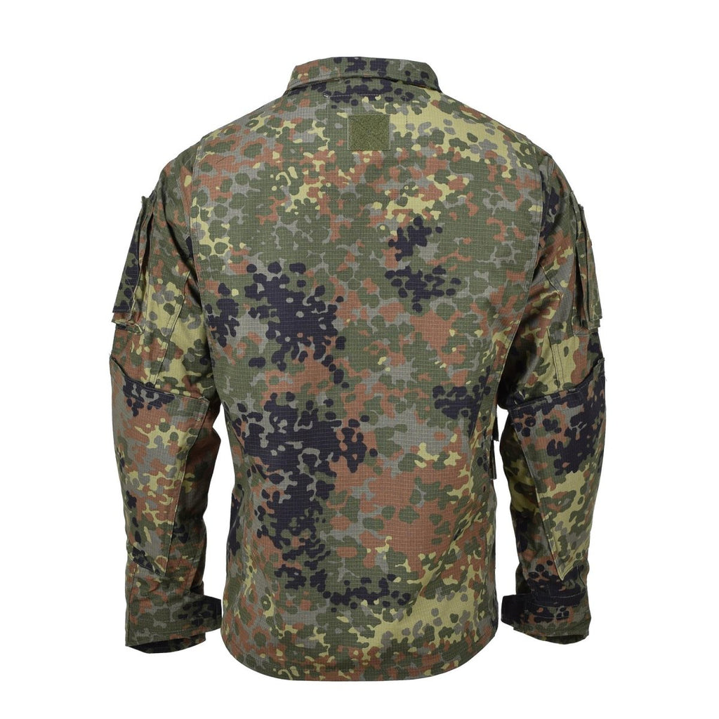 - Made from high-quality ripstop fabric, this flecktarn camo shirt resists tearing and holds up against heavy wear. The durable material ensures long-lasting use, making it perfect for extreme outdoor conditions. The flecktarn camouflage pattern blends seamlessly with natural surroundings, offering effective concealment in wooded terrain.